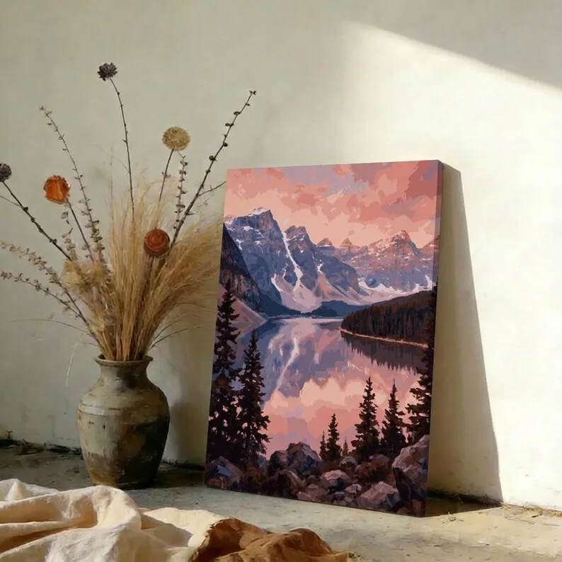 Pre-printed numbered canvas with our exclusive mountain lake sunset artwork